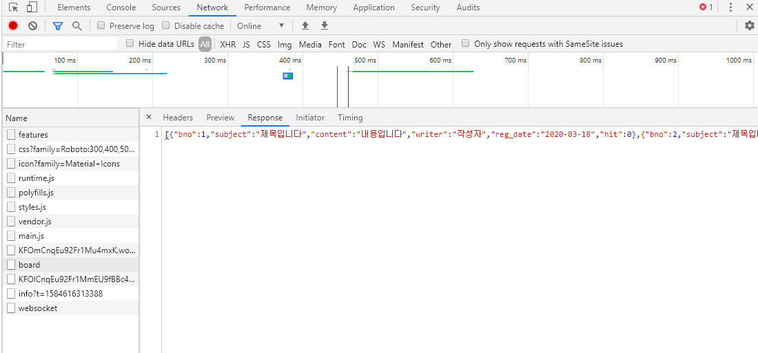 그 후 Run을 통해서 하단의 주소에서 버튼을 클릭해 결과를 개발자도구 network의 board에서 확인이 가능합니다.