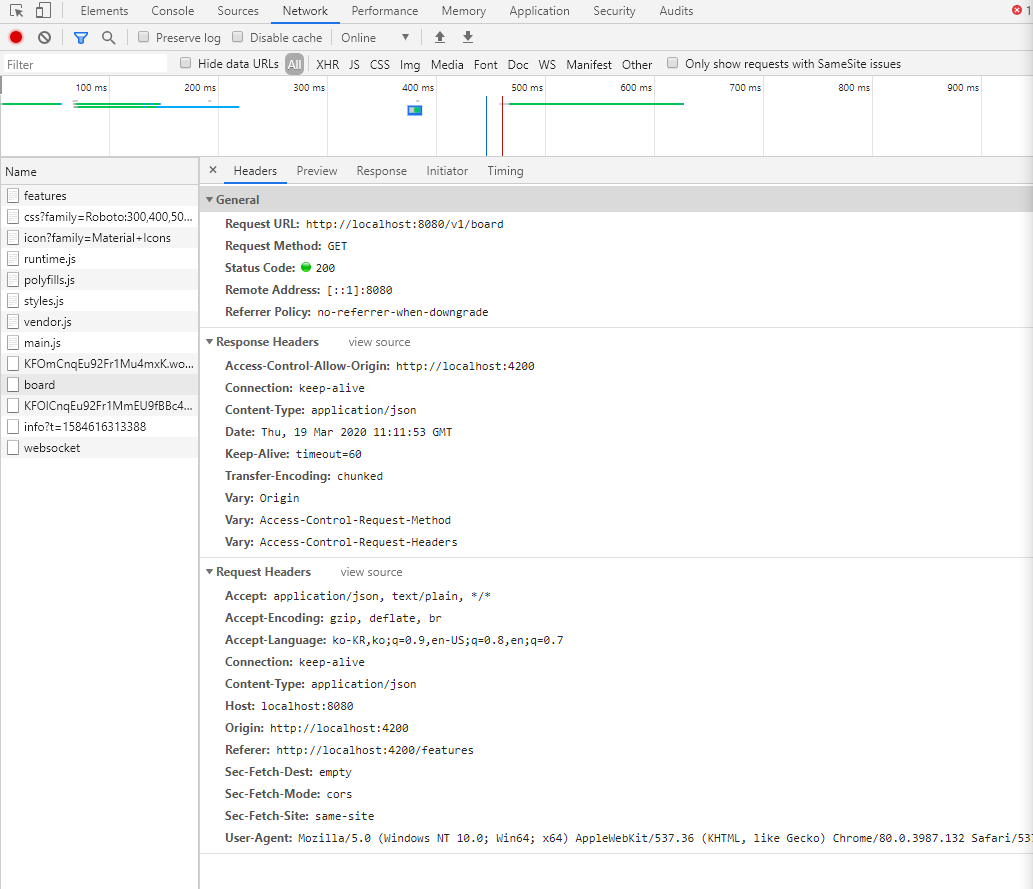 board의 Header와 Response을 통해 API와 연동이 정상적으로 이루어지는 것을 알 수 있습니다.
