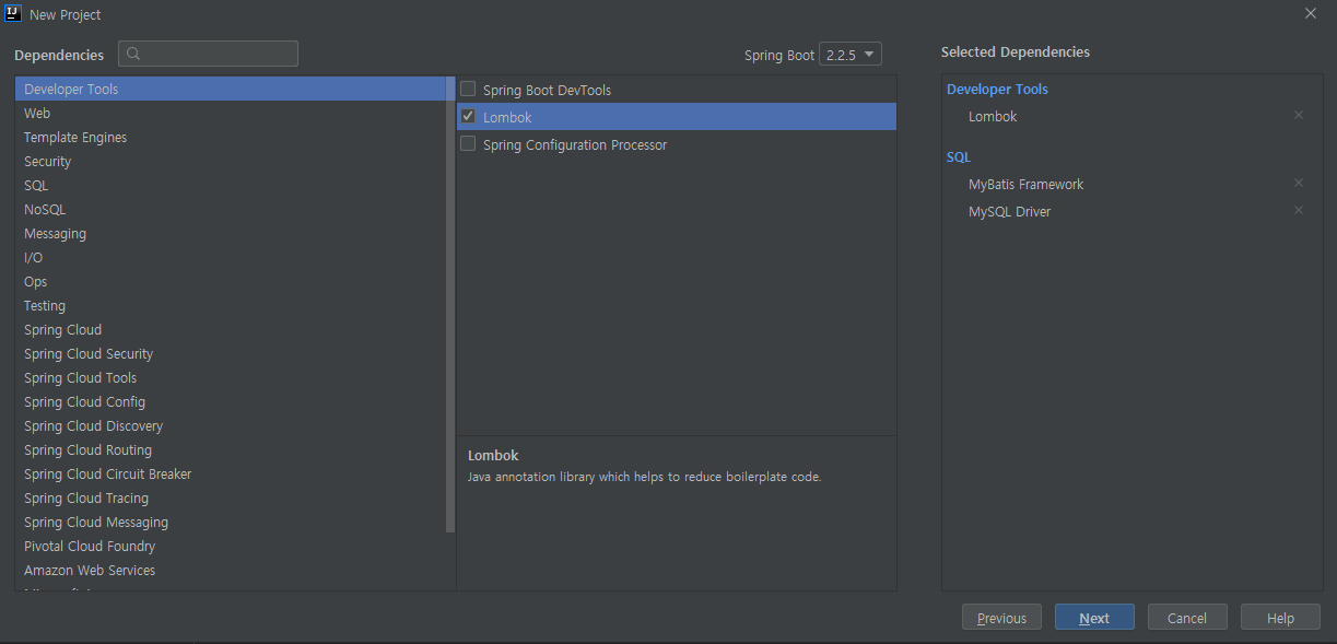 ! Lombok, MySQL Driver, MyBatis Framework, Spring Web을 추가합니다.