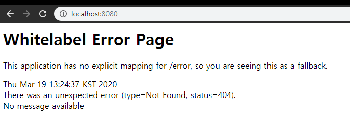 http://localhost8080으로 접속하면 아래와 같이 출력되며 성공적으로 스프링 부트가 실행됩니다.